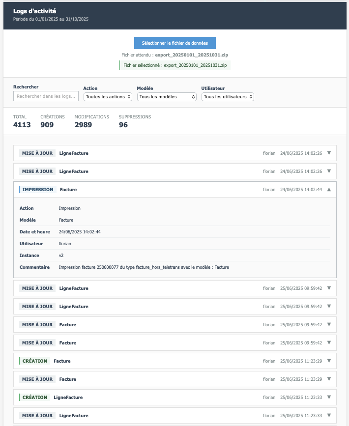 timestamp: Date et heure de l'action (ISO 8601)user: Utilisateur ayant effectué l'actionaction: Type d'actionmodel: Type d'objet modifié (Facture, Reglement, Patient, etc.)instance: Identifiant de l'objet modifiédiff: Détail des modifications (format JSON)commentaire: Commentaire optionnelsignature: Signature blockchain de ce logprevious_signature: Signature du log précédent